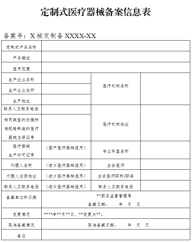 第八條 醫療器械生產企業及醫療機構共同作為定制式醫療器械備案人,在生產、使用定制式醫療器械前應當向醫療器械生產企業所在地(進口產品為代理人所在地)省、自治區、直轄市藥品監督管理部門備案。備案資料符合形式要求的,省、自治區、直轄市藥品監督管理部門當場予以備案(見附1—3)。備案資料不齊全或者不符合規定形式的,應當一次告知需要補正的全部內容。對不予備案的,應當告知備案人并說明理由。