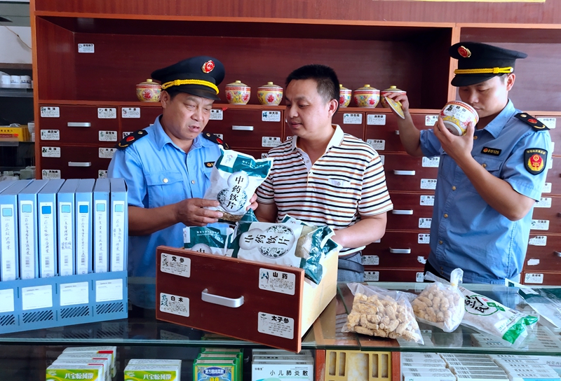 圖為江西省贛州市于都縣市場監管局執法人員在某藥店檢查中藥材、中藥飲片進貨臺賬、中藥飲片包裝,標簽標識、貯藏條件和中藥飲片質量。