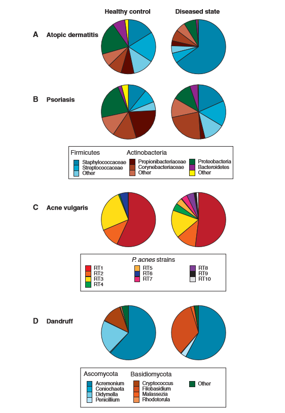 兩大類別菌群的平衡對皮膚健康有重要意義。菌群的過度增殖或者過度缺乏,將導致皮膚微生態的失衡,進而引發皮膚問題,如痘痘、過敏性皮炎、銀屑病、頭皮屑(圖3.不同皮膚問題下微生物變化圖)。例如,過敏性皮炎是一種常見皮膚疾病,有研究證明金黃色葡萄球菌與過敏性皮炎相關的,而過敏性皮炎的嚴重程度與細菌多樣性的減少有一定關聯。斑塊狀銀屑病和滴狀銀屑病被證明與鏈球菌的感染有關。痘痘則與皮膚常駐菌痤瘡丙酸桿菌過度增殖有關。毛囊皮脂腺是油脂排出的重要通道,當油脂的分泌速度大于排出速度時,就出現了毛孔堵塞的現象。含量豐富的油脂形成的厭氧環境使得痤瘡丙酸桿菌大量生長,其分泌的物質不僅遠遠超過皮膚本來的承受力,同時可激活皮膚的免疫應激反應,導致皮膚出現丘疹等。此外,頭皮屑是一種常見皮膚問題,馬拉色菌被證明是導致頭皮屑的最主要原因,并且隨著頭皮屑嚴重程度的增加,馬拉色菌、青霉菌的豐富度也在增加(圖3.不同皮膚問題下微生物變化圖)。