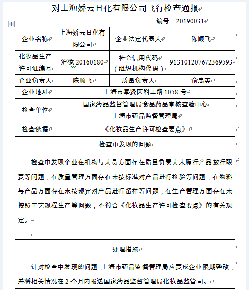 飛檢通報:對上海嬌云日化有限公司飛行檢查通報