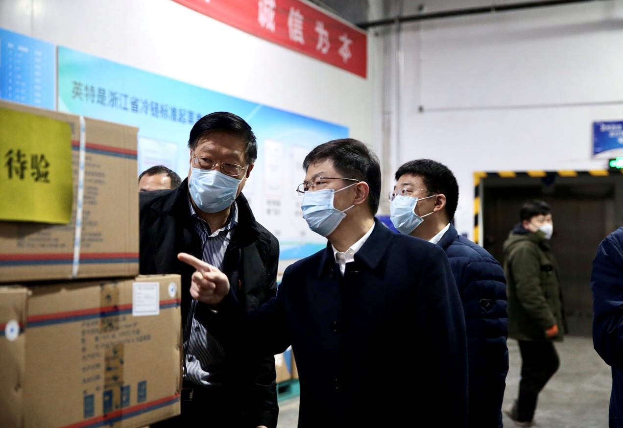 浙江省藥監(jiān)局黨組書記、局長徐潤龍(前排右)一行赴英特集團物流倉庫開展現(xiàn)場辦公,協(xié)調(diào)解決醫(yī)用防護用品供應(yīng)保障問題。(浙江省藥監(jiān)局供圖)