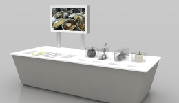 互動中,參與者操作觸摸屏,選擇一種想要了解的中藥,相應的中藥標本會從展臺內升至臺面,參與者可觀看這種中藥標本的特征,投影機會投影視頻介紹這種藥材的來源、藥性、炮制原理、炮制過程、功效等知識。