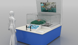 互動時,參與者觀看展柜上顯示屏播放的多媒體視頻,了解手術的內容和操作技巧。通過操作桿控制機器手臂模型運動,模擬為人體模型進行手術。手術過程中,參與者需根據操作臺上的顯示屏實時監控手術的狀態,控制展柜內機器人手臂的動作。如果手術過程中碰觸到血管及其他組織,顯示屏中多媒體影像顯示出血,手術失敗。如切除部位正確,則顯示手術成功。