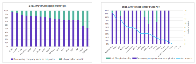 中國公司強(qiáng)調(diào)自主研發(fā),78%的熱門靶點(diǎn)項(xiàng)目都是由發(fā)起該項(xiàng)目的同一家公司開發(fā),僅7%來自合作。聯(lián)合用藥成為大趨勢(shì),所有靶點(diǎn)均聯(lián)用PD1/L1抑制劑,另有一半聯(lián)用CTLA-4。