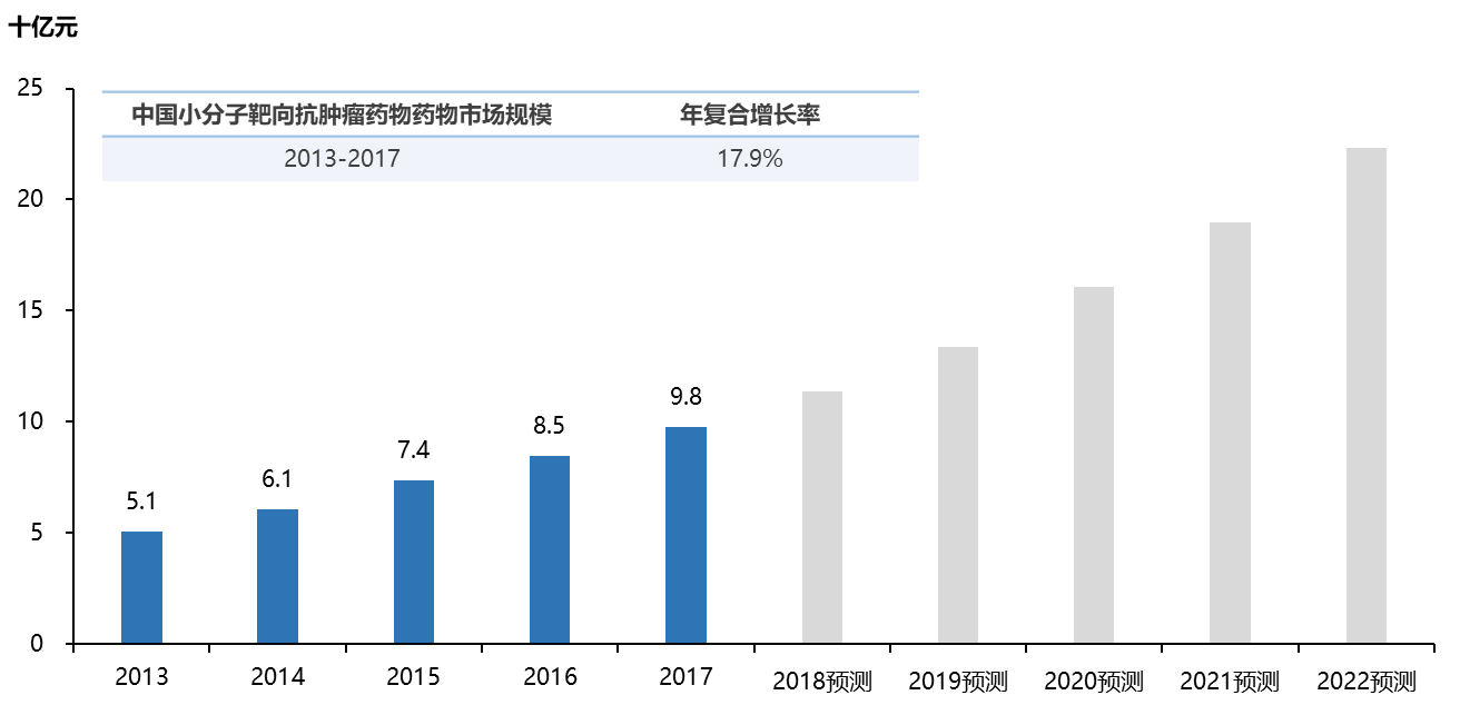 中國小分子靶向抗腫瘤藥物市場規模,2013-2022年(預測)