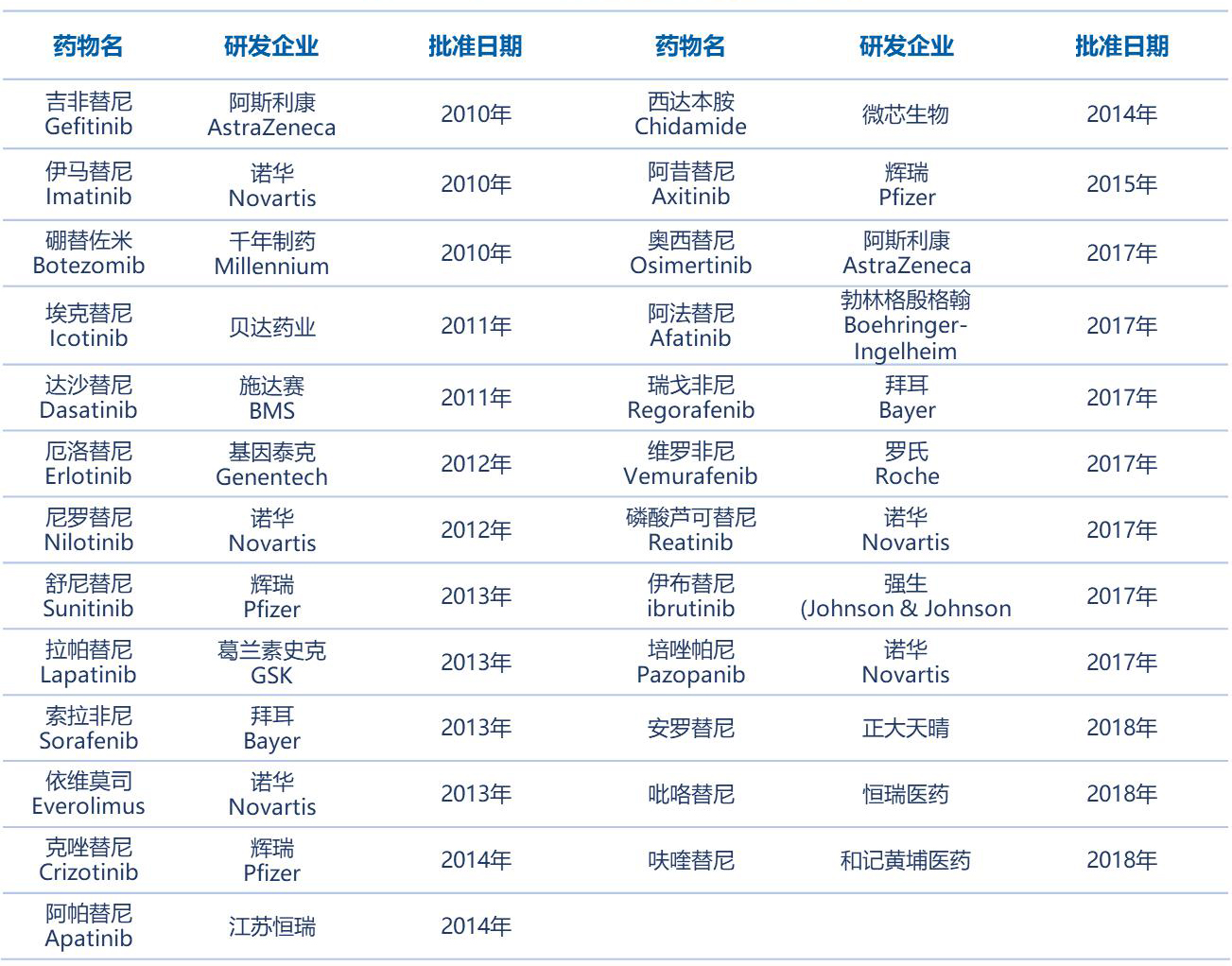 中國批準上市的小分子靶向抗腫瘤藥物,截至2018年