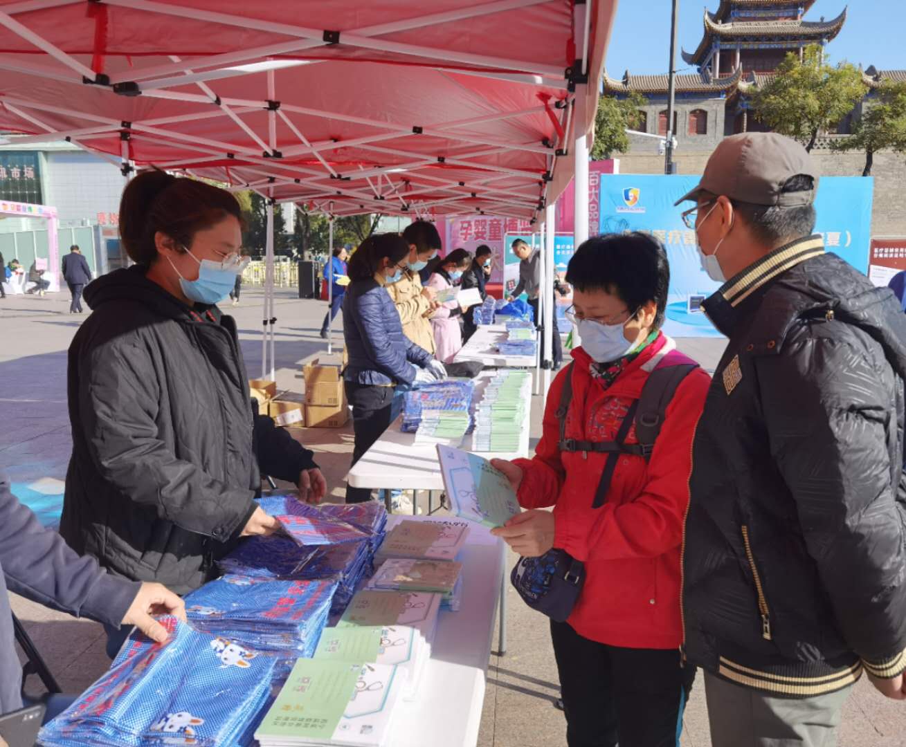 圖為啟動儀式現場工作人員為群眾送上宣傳資料。