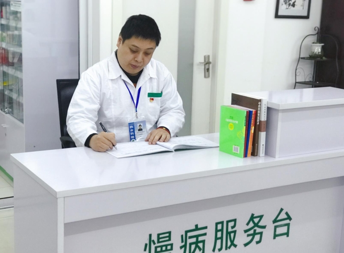 圖為魏駿在華氏易美健藥房整理慢病顧客檔案。