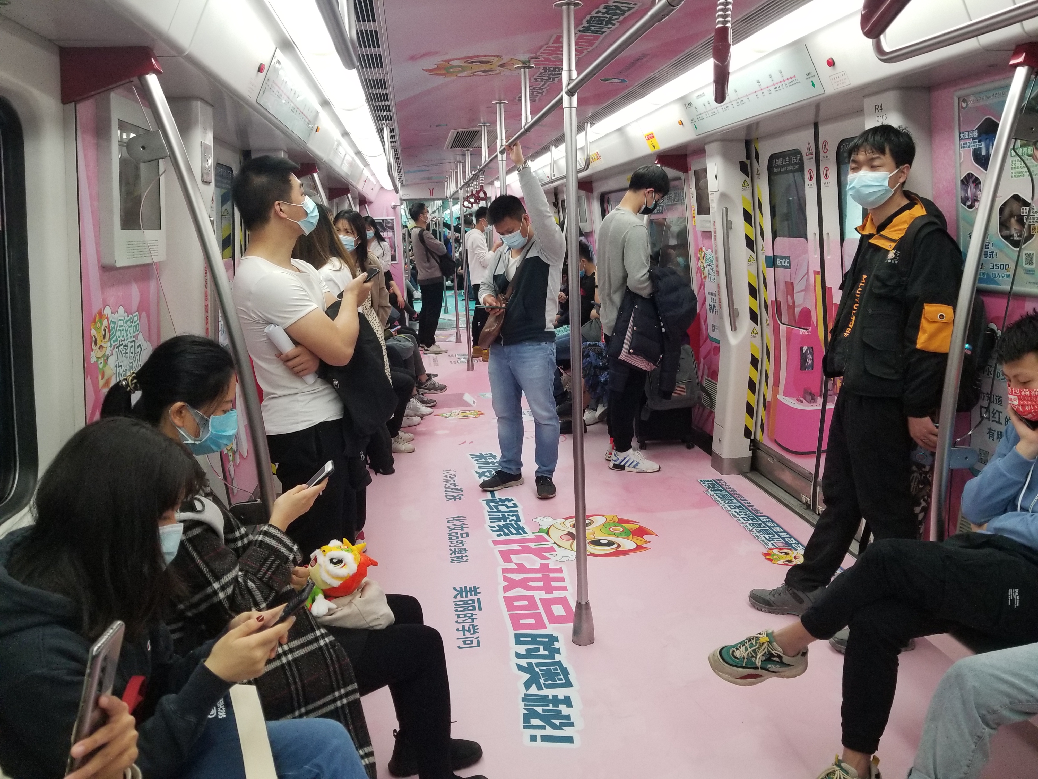 三號車廂的主題內容是化妝品,車廂內包選用了女性偏愛的粉色作為主色調,以吸引更多的女性乘客對該節車廂特別關注。車廂呈現的展品包括“探尋芬芳之旅”“魅力口紅”“美容鏡”“防曬化妝品”“拜拜痘痘”等,這些常在化妝品專柜和時尚雜志看到的內容,其實背后都蘊藏著豐富的科學知識。該節車廂的車頂是琳瑯滿目的化妝品卡通圖案,讓女性乘客對美麗心馳神往,引導她們帶著關于美麗妝顏的問題走進科學中心的科普館,進一步了解皮膚的科學、化妝的正確使用等更多關于化妝品背后的故事。