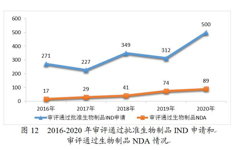 藥審中心審評通過批準生物制品IND申請500件,較2019年增長60.26%。其中,預防用IND申請19件;治療用IND申請481件,較2019年增長63.61%。審評通過生物制品NDA 89件,較2019年增長20.27%。其中,預防用NDA 7件;治療用NDA 81件(制劑77件),較2019年增長19.12%;體外診斷NDA 1件。2020年生物制品各類注冊申請審評完成的具體情況詳見表4,2016-2020年審評通過批準生物制品IND申請和審評通過NDA情況詳見圖12。