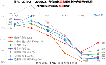 自2019年第一季度開始,除依達拉奉在2019年第二季度唯一出現(xiàn)一次正增長外,其他時段每個季度都在下滑,如長期穩(wěn)居銷售首位的神經(jīng)節(jié)苷脂(20mg)銷售增速由2019Q1的-22%下降到了2020Q2的-58%,馬來酸桂哌齊特(80mg/2ml)由2019Q1的-21%下降到了2020Q2的-89%。