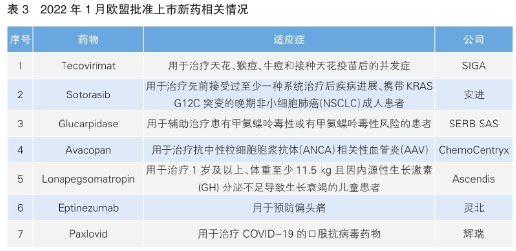 1月份,歐盟共批準(zhǔn)7款新藥上市。根據(jù)Phar madigger數(shù)據(jù)庫信息,這7款新藥均不是全球首次獲批(詳見表3)。