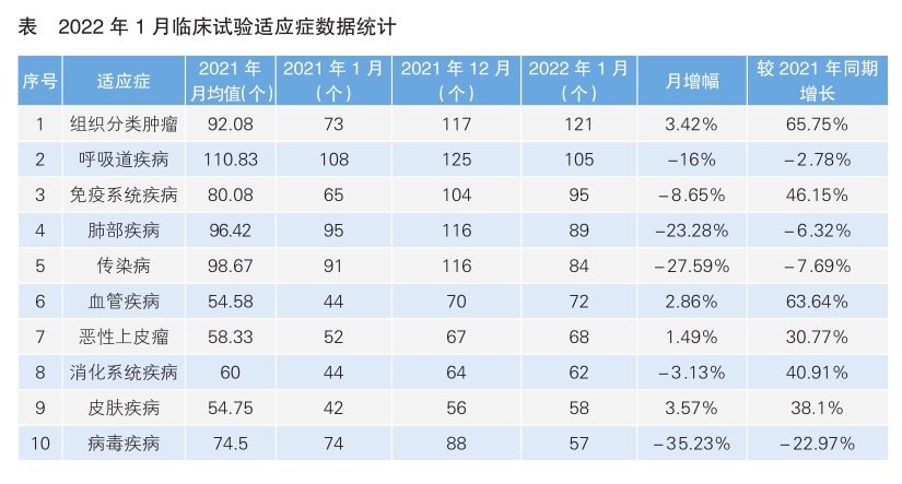從1月份新增臨床試驗的熱門適應癥情況來看,組織分類腫瘤仍為最熱門研發領域,試驗數量為121項,相較于2021年12月份上升3.42%。1月份主要熱門適應癥的臨床試驗相較于2021年12月份大多呈現上升趨勢,下降明顯的熱門適應癥為病毒類疾病。推測新冠肺炎疫情對于臨床試驗的影響正在顯著下降,臨床試驗正在逐步恢復常態。