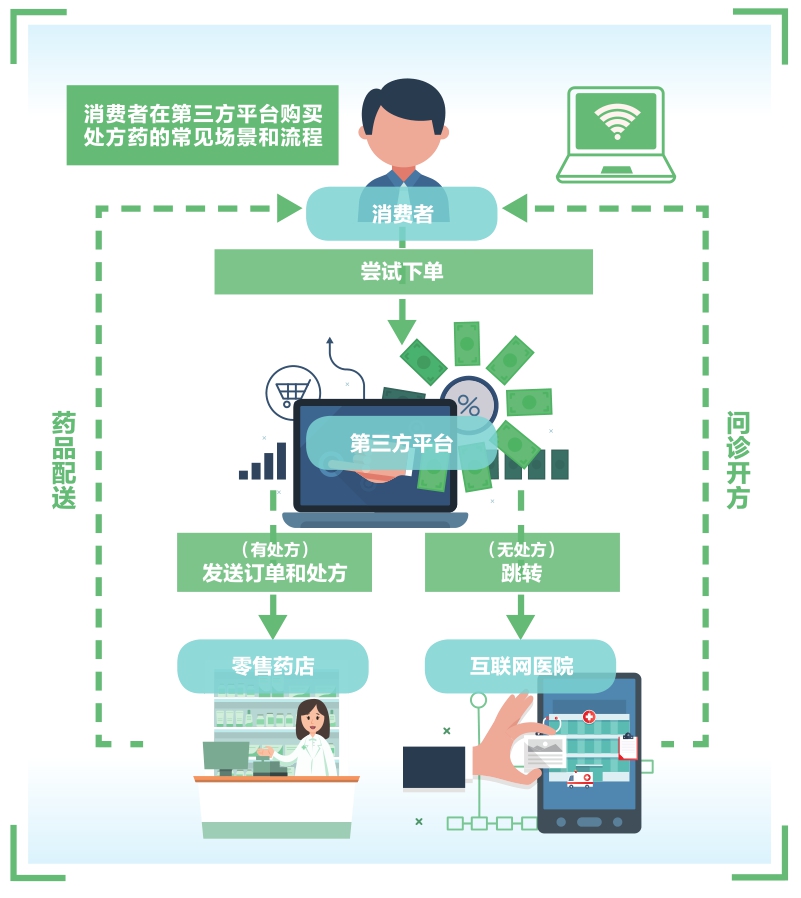通常而言,消費(fèi)者在第三方平臺(tái)購買處方藥的場景和流程如下圖。