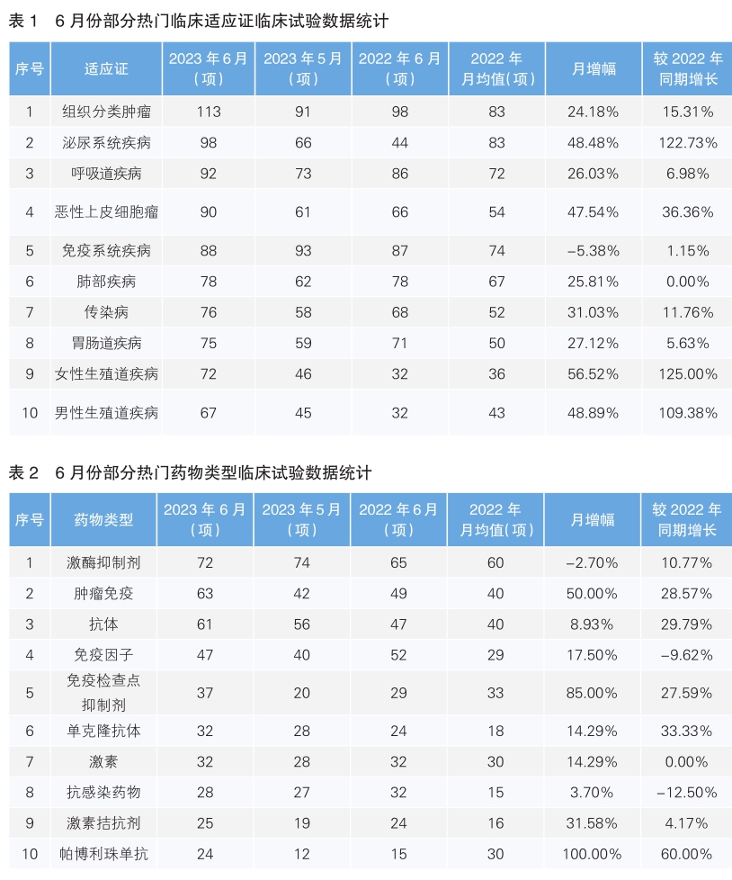 這是泌尿系統疾病首次進入熱門適應證領域前三,男性及女性生殖道疾病首次進入熱門適應證領域前十。相較于2022年同期,女性生殖道疾病領域新開臨床試驗增長125%,男性生殖道疾病領域新開臨床試驗增長109.38%,整體增長122.73%。6月份熱門適應證臨床試驗數量相較于上月僅有免疫系統疾病領域出現下降,月降幅僅為5.38%,但相較于2022年同期仍有增長。肺部疾病是本月熱門適應證中唯一未增長領域。(詳見表1)