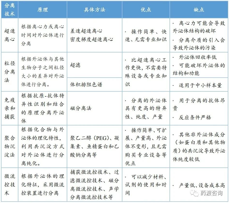 目前,研究人員已根據外泌體的大小、密度、表面電荷以及其表面相關的蛋白質開發了多種外泌體分離方法,主要包括超速離心、超濾、體積排阻色譜、免疫親和捕獲、聚合物沉淀法和微流控技術(各技術原理及優缺點見下表)。