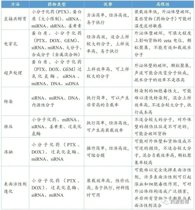 外源性裝載是通過電穿孔或脂質體轉染等方法將目的藥物導入分離后的外泌體中。目前,外源性裝載可裝載小分子化藥、蛋白質、多肽、核酸藥物、天然產物等,裝載藥物方式主要包括直接共孵育、電穿孔、超聲處理、轉染、擠壓、凍融、表面活性劑透化(詳見下表)。