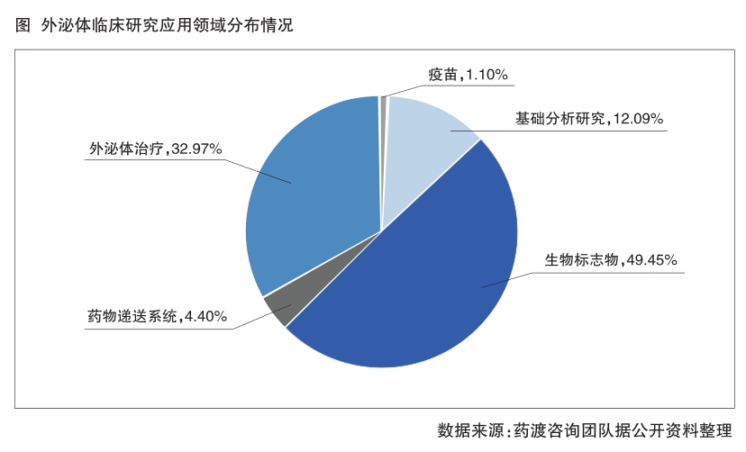 182項外泌體領域的臨床研究中,有90項(49.45%)是關于生物標志物的應用,59項(32.97%)為外泌體治療藥物研究,8項(4.40%)關于藥物遞送系統,22項(12.09%)屬于外泌體基礎分析研究;此外,疫苗類臨床研究有3項(1.10%)(詳見圖)。