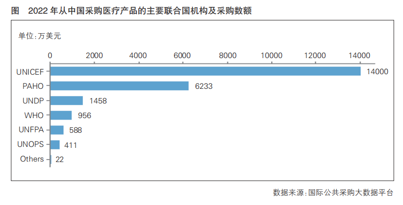2022年,中國在聯合國采購中供應了5億美元的產品,占聯合國采購總額的1.69%,排名由2021年的第3名跌至第15名。2022年共有13個聯合國機構從中國采購醫療產品,采購額達2.29億美元。其中,最主要的采購類別為醫療器械及設備,采購額為1.4億美元;其后是藥品、避孕藥具和疫苗,采購額為8900萬美元。UNICEF的采購金額最高,達1.4億美元,占比高達61%。