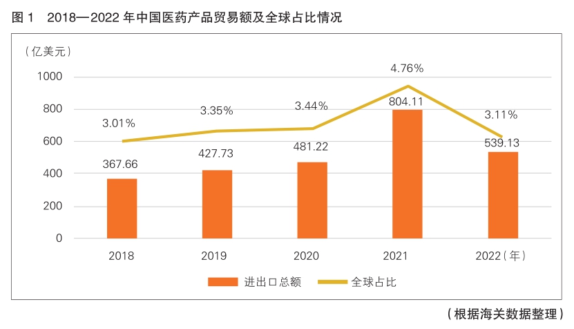 聯(lián)合國有關(guān)機(jī)構(gòu)統(tǒng)計(jì)數(shù)據(jù)顯示,2018—2022年的五年間,中國醫(yī)藥產(chǎn)品貿(mào)易總額由367.66億美元升至539.13億美元,全球占比穩(wěn)定在3.5%左右,全球排名由第十位升至第九位(詳見圖1)。