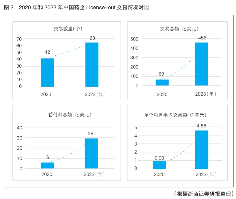 據(jù)雅法全球醫(yī)療(YAFA)報(bào)告統(tǒng)計(jì),2023年中國藥企共計(jì)進(jìn)行了63筆License-out交易,同比增長80%,且數(shù)量首次超過Licensein(詳見圖2)。