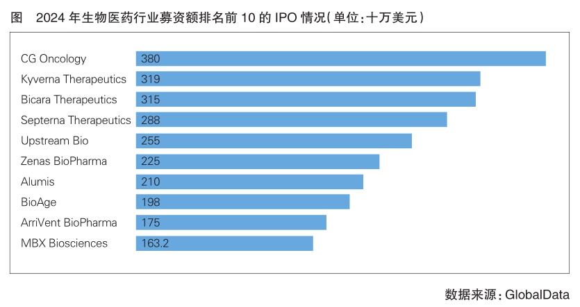 2024年,醫(yī)藥市場逐步回暖,全球生物醫(yī)藥領(lǐng)域共有54起成功的首次公開募股(IPO),融資額突破53億美元,其中腫瘤治療領(lǐng)域是熱點。盡管IPO節(jié)奏有所放緩,但生物技術(shù)企業(yè)IPO仍取得顯著進(jìn)展。