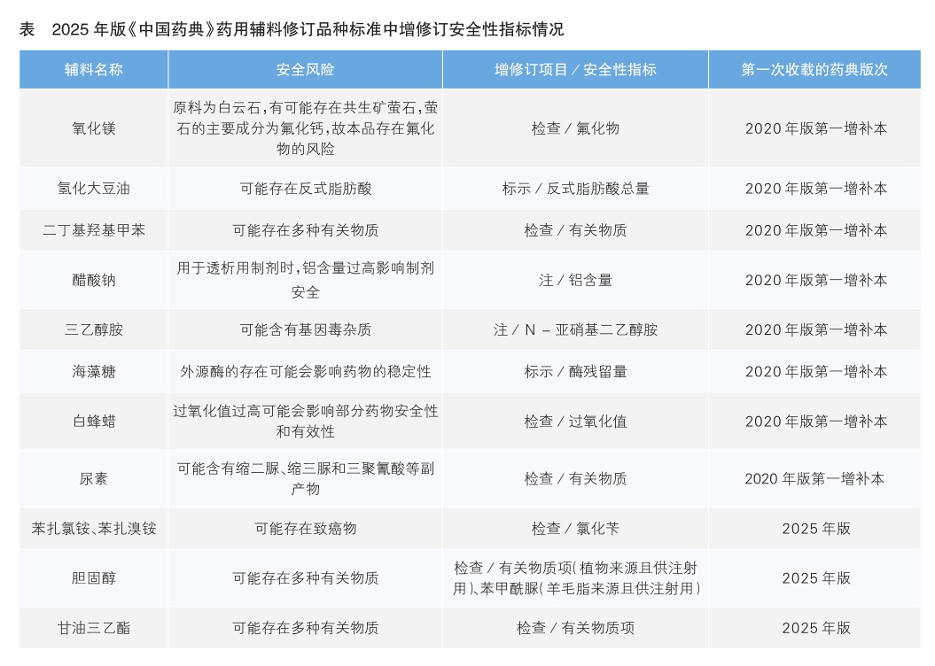 藥用輔料安全性分為輔料自身安全性和輔料對制劑安全性影響兩類。2025年版《中國藥典》中繼續拓展藥用輔料品種標準中安全性指標的收載(詳見表)。