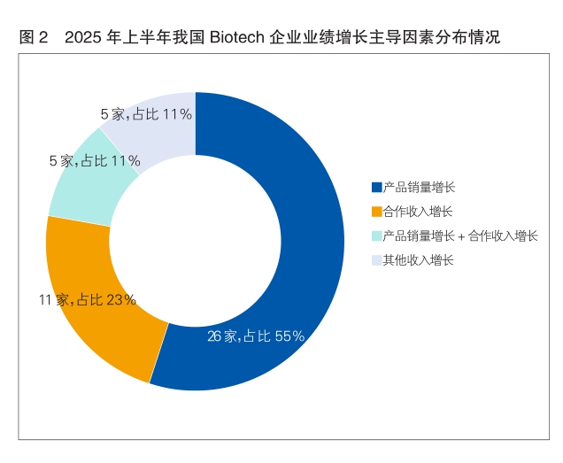 從具體數據來看,在47家上半年營收同比增長的Biotech企業中,有26家將其增長主因歸結為“產品銷量增長”,占比高達55%(詳見圖2)。這充分說明,創新藥的成功商業化已成為推動行業發展的首要引擎。從過去較多依賴BD合作,轉向更加注重和強化主營產品的自主商業化能力。這一趨勢在上半年的業績表現中尤為明顯,多數實現營收增長的企業,其增長驅動力主要來自創新藥上市后的快速市場放量。