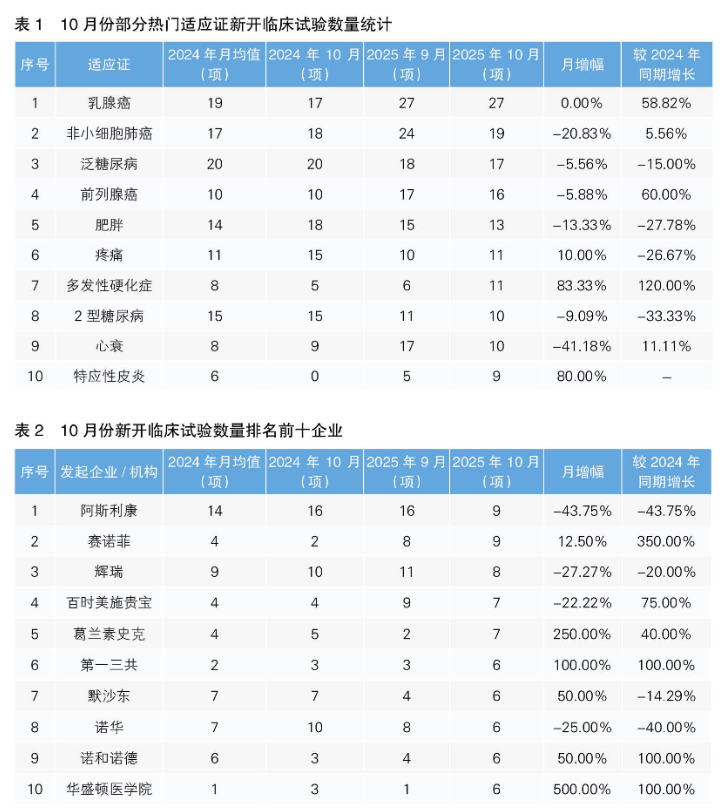 從10月份新開臨床試驗熱門適應證來看,乳腺癌為最主要的熱門研發領域,新開臨床試驗27項,環比持平,同比上漲58.82%。其次為非小細胞肺癌,新開臨床試驗19項,環比下降20.83%,同比上漲5.56%。值得注意的是,10月份新開臨床試驗數量上升幅度最大的熱門適應證為多發性硬化癥,由9月份的6項上升至11項,上升幅度為83.33%;新開臨床試驗數量下降幅度最大的適應證為心衰,由9月份的17項下降到10項,下降幅度為41.18%。(詳見表1)