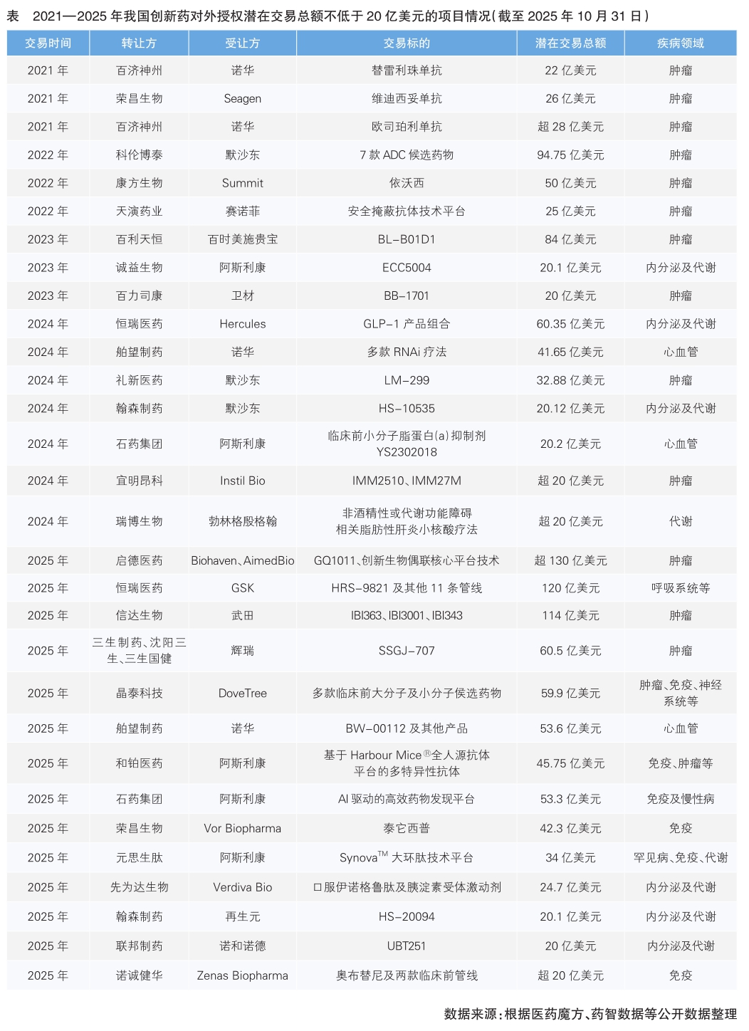 從交易規(guī)模來看,2021—2022年,所有單筆金額超過20億美元的重磅交易均集中于腫瘤領(lǐng)域;2023年起,內(nèi)分泌和代謝性疾病產(chǎn)品開始進(jìn)入這一行列;2024—2025年,呼吸系統(tǒng)疾病、自身免疫性疾病、神經(jīng)系統(tǒng)疾病、罕見病等非腫瘤領(lǐng)域用藥,也陸續(xù)進(jìn)入重磅交易范疇。