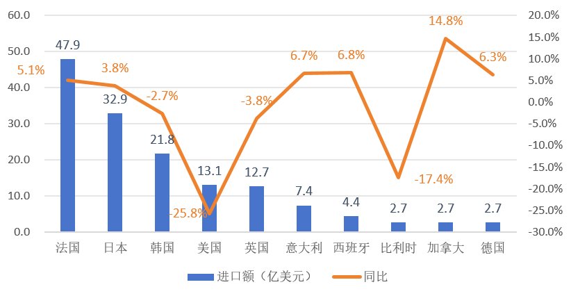 圖1 2025年中國化妝品十大進口來源地進口額情況