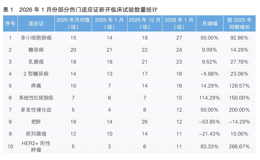 從1月份新開臨床試驗(yàn)熱門適應(yīng)證來看,非小細(xì)胞肺癌為最熱門的研發(fā)領(lǐng)域,新開臨床試驗(yàn)27項(xiàng),環(huán)比上升50%,同比上漲92.86%。其次為糖尿病,新開臨床試驗(yàn)數(shù)量為24項(xiàng),環(huán)比上升9.09%,同比上漲14.29%。值得注意的是,1月份新開臨床試驗(yàn)數(shù)量上升幅度最大的熱門適應(yīng)證為系統(tǒng)性紅斑狼瘡,由去年12月份的7項(xiàng)上升至15項(xiàng),上升幅度為114.29%;新開臨床試驗(yàn)數(shù)量下降幅度最大的熱門適應(yīng)證為肥胖,由去年12月份的26項(xiàng)下降到12項(xiàng),下降幅度為53.85%。(詳見表1)