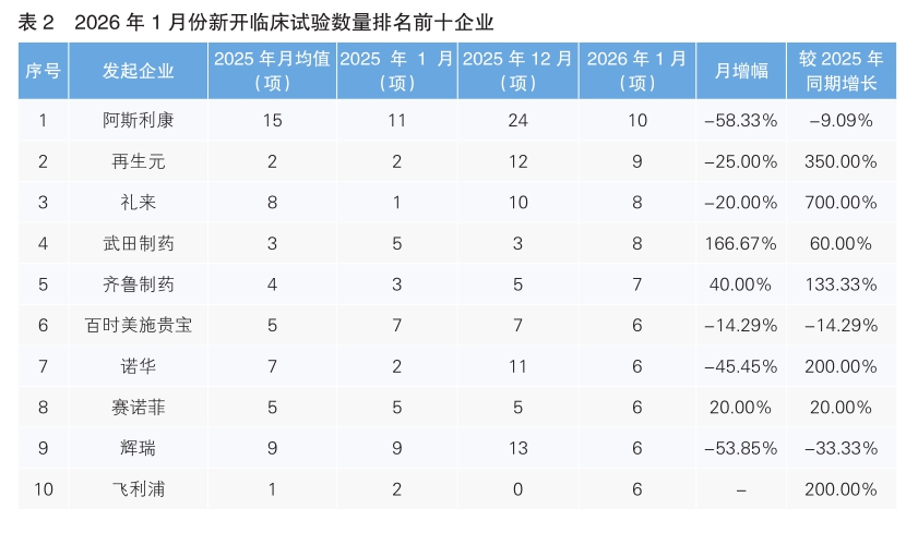 對(duì)新開臨床試驗(yàn)的發(fā)起單位進(jìn)行統(tǒng)計(jì)后發(fā)現(xiàn),1月份發(fā)起臨床試驗(yàn)最多的企業(yè)是阿斯利康,新開臨床試驗(yàn)10項(xiàng),環(huán)比下降了58.33%。其次為再生元,新開臨床試驗(yàn)9項(xiàng),環(huán)比下降了25%。新開臨床試驗(yàn)數(shù)量上升幅度最大的企業(yè)為武田制藥,環(huán)比上升了166.67%。值得注意的是,1月份我國藥企齊魯制藥進(jìn)入新開臨床試驗(yàn)數(shù)量排名前十榜單,新開臨床試驗(yàn)7項(xiàng),環(huán)比增長40.00%,同比增長133.33%。(詳見表2)