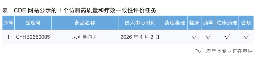 5.CDE網(wǎng)站公示1個(gè)仿制藥質(zhì)量和療效一致性評價(jià)任務(wù)(詳見表),所涉藥品為尼可地爾片。