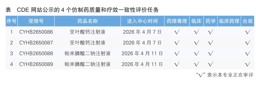 7.CDE網(wǎng)站公示4個仿制藥質(zhì)量和療效一致性評價任務(詳見表),涉及亞葉酸鈣注射液等品種。