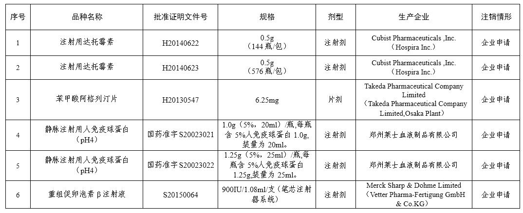 9月7日,國家藥藥監(jiān)局發(fā)布消息,根據(jù)《中華人民共和國藥品管理法實施條例》和《藥品注冊管理辦法》的有關(guān)規(guī)定,國家藥監(jiān)局決定注銷注射用達托霉、苯甲酸阿格列汀片、靜脈注射用人免疫球蛋白(pH4)、重組促卵泡素β注射液等6個藥品批準證明文件,注銷注冊批準證明文件品種目錄如下。