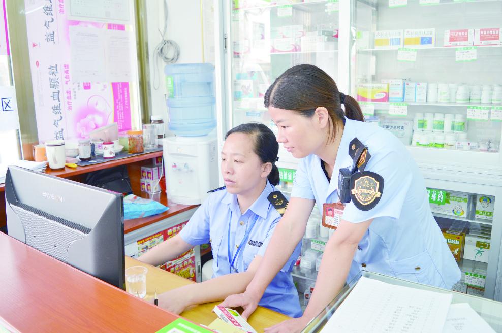 上圖為該局執(zhí)法人員在藥店檢查藥品追溯系統(tǒng)數(shù)據(jù)及采購驗收記錄。 鐘人木 攝