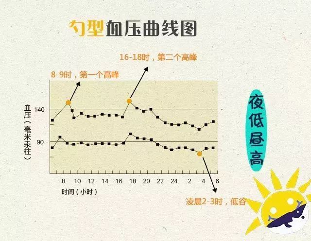 勺型血壓患者的血壓變化規律是正常的“晝高夜低,兩峰一谷”現象。