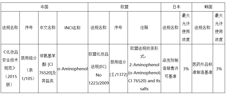 歐盟消費者安全科學委員會(SCCS)于2010年6月,曾發布該組分的評估報告:“因沒有足夠的安全性資料,不能給出鄰氨基苯酚的安全性結論。”歐盟委員會在2013年4月修訂歐盟化妝品法規(EC)No1223/2009時,將該組分列入化妝品禁用組分清單(附錄Ⅱ)。