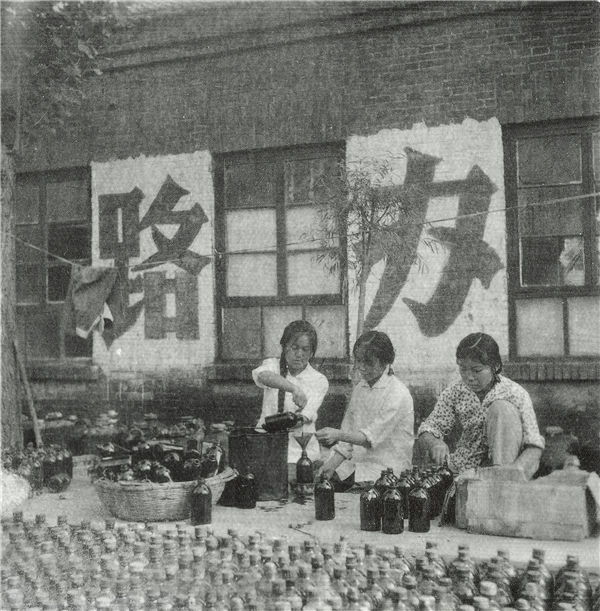 20世紀70年代初期神威藥業(yè)前身南王中學(xué)“五·七”化工廠灌裝紫藥水生產(chǎn)現(xiàn)場