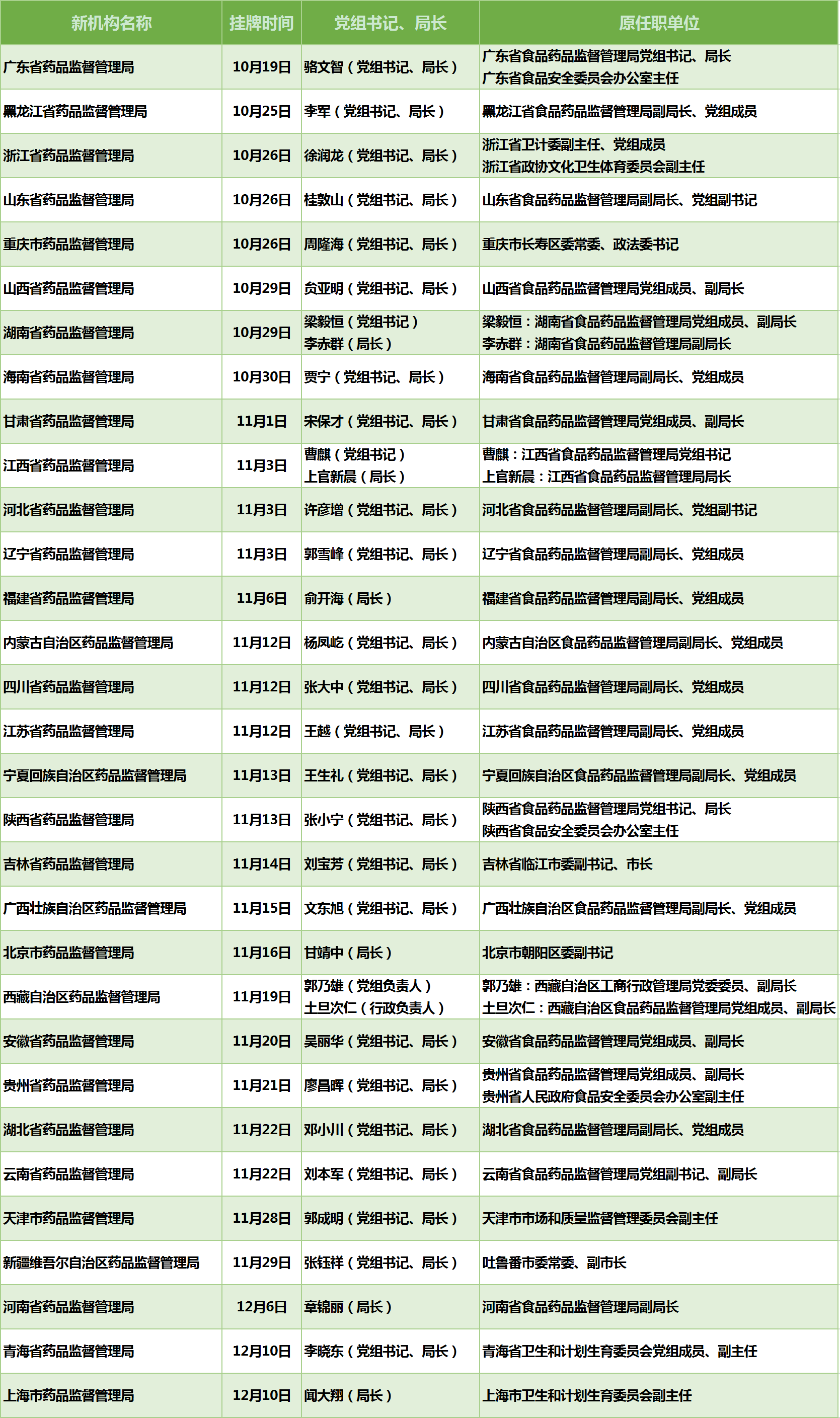 根據(jù)各省機構(gòu)改革具體實施方案和時間表,10月19日廣東省藥品監(jiān)管局掛牌成立,12月10日青海省藥品監(jiān)督管理局掛牌履職。至此,全國31個省級藥品監(jiān)督管理局均已正式掛牌成立,新領(lǐng)導(dǎo)班子陸續(xù)履新。據(jù)統(tǒng)計,大部分省份的黨組書記、局長來自原食品藥品監(jiān)督管理局。