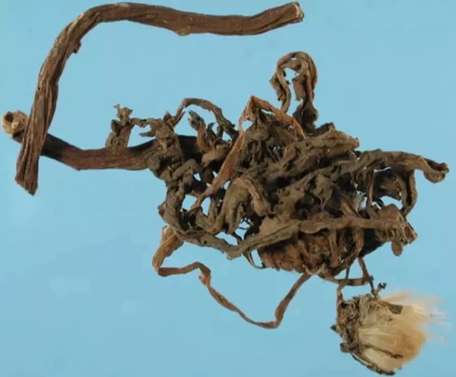 性狀鑒別:本品呈皺縮卷曲的團塊。根呈圓錐狀,多彎曲,長3~7cm;表面棕褐色,抽皺;根頭部有棕褐色或黃白色的茸毛,有的已脫落。葉基生,多皺縮破碎,完整葉片呈倒披針形,綠褐色或暗灰綠色,先端尖或鈍,邊緣淺裂或羽狀分裂,基部漸狹,下延呈柄狀,下表面主脈明顯。花莖1至數條,每條頂生頭狀花序,總苞片多層,內面一層較長,花冠黃褐色或淡黃白色。有的可見多數具白色冠毛的長橢圓形瘦果。氣微,味微苦。