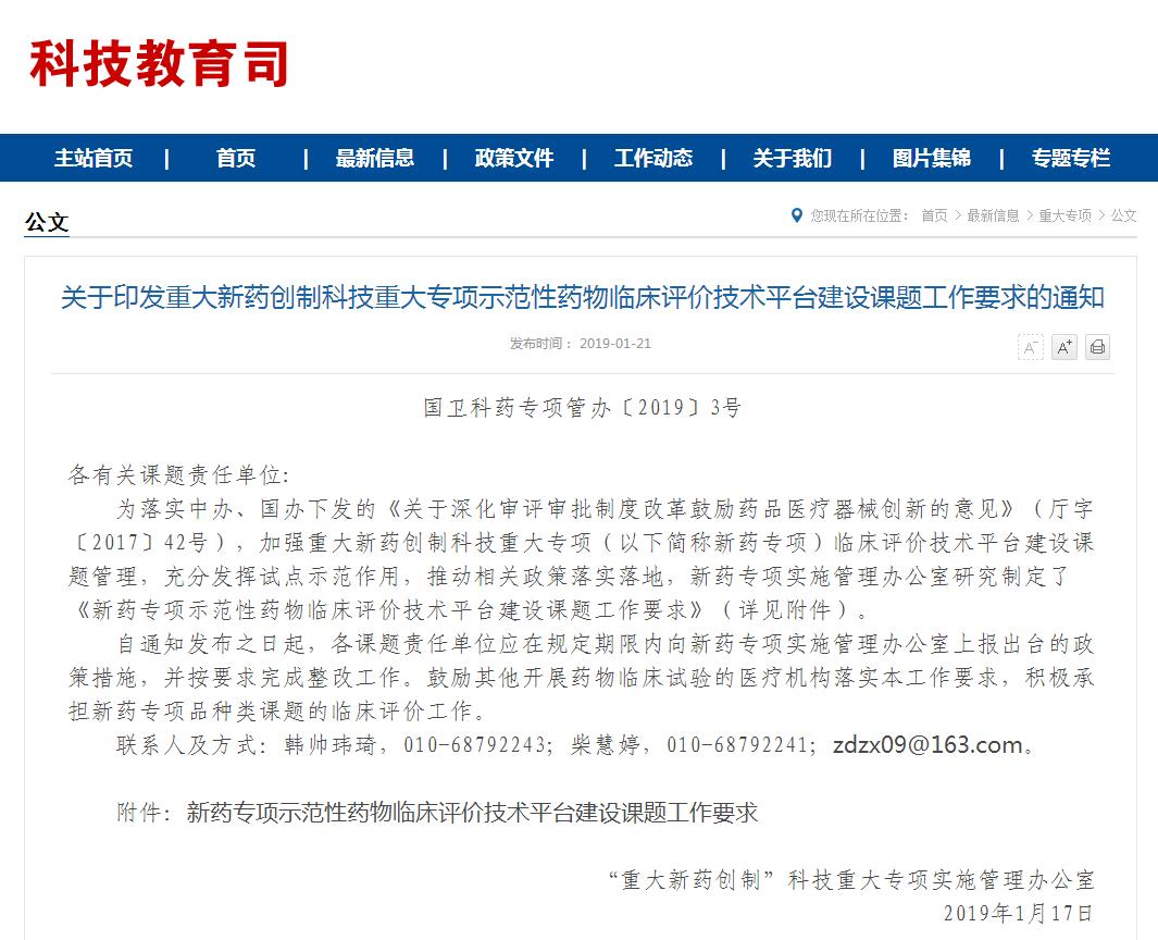 1月22日,國家衛(wèi)健委網(wǎng)站發(fā)布公告,“重大新藥創(chuàng)制”科技重大專項實施管理辦公室研究制定了《新藥專項示范性藥物臨床評價技術(shù)平臺建設(shè)課題工作要求》,旨在落實《關(guān)于深化審評審批制度改革鼓勵藥品醫(yī)療器械創(chuàng)新的意見》,加強重大新藥創(chuàng)制科技重大專項臨床評價技術(shù)平臺建設(shè)課題管理,充分發(fā)揮試點示范作用,推動相關(guān)政策落實落地。