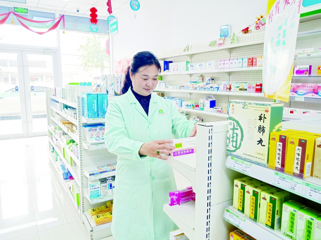 圖為白秀蘭在藥店里整理藥品。