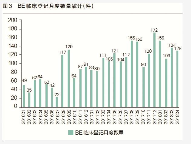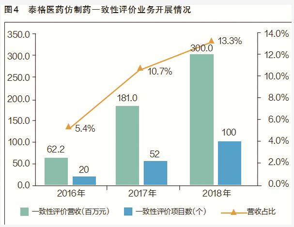 藥智網統計數據顯示,BE臨床新登記月度數量從2016年8月開始大幅增加,到2018年4月一直保持著較高的數量,這從側面反映出一致性評價工作正在加速(見圖3)。仿制藥一致性評價為CRO行業帶來了明顯的業務增量,以泰格醫藥為例,2016年,該公司仿制藥一致性評價收入約為6220萬元,僅占其營收總額的5%左右;2017年,來自仿制藥一致性評價的業務收入大幅提升到1.81億元,同比大增190%,營收占比提升到10.7%;2018年全年,預計該公司完成了約100個一致性評價項目,營業收入有望超過3億元(見圖4)。