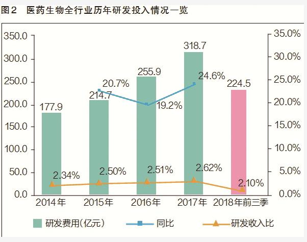 近年來,我國生物醫藥行業上市公司研發投入持續加大,不論是絕對數還是研發收入占比,都呈現出上漲趨勢。2015年,行業整體研發投入突破200億元大關,達到214.7億元,同比增長20.7%,研發收入比為2.5%;2016~2017年,研發投入年增速高于營收增速,2017年研發投入突破300億元,研發收入比上升到2.62%;2018年前三季度,全行業研發投入總額達到224.5億元,研發收入比約為2.1%(見圖2)。研發投入的快速增長,直觀反映出企業研發需求的旺盛程度。