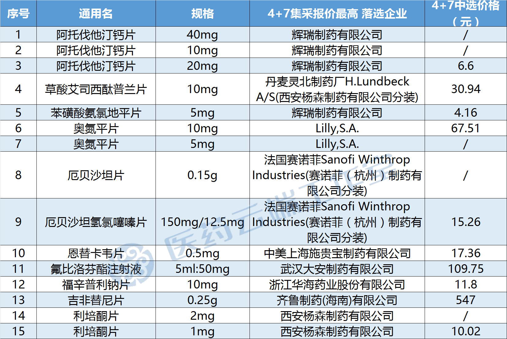 這張表格中,除了3個國內藥企(齊魯、華海、大安)以外,其余都是外資藥企,包括輝瑞的立普妥、絡活喜、阿斯利康的可定、賽諾菲的波立維、益普生的思密達等等,這些藥品,在國內市場上一直是領先的一線品牌,也都因為在4+7集采中報價最高而落選。