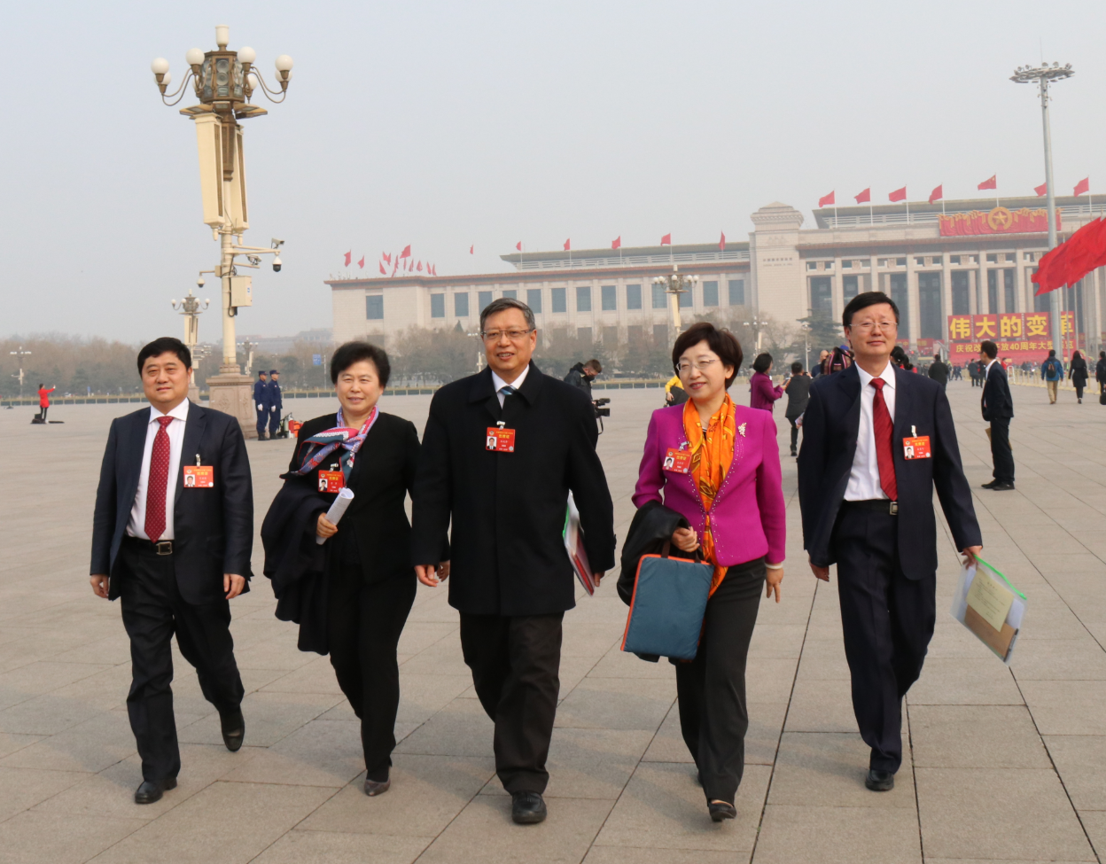 3月3日下午,全國政協十三屆二次會議在京開幕,全國政協醫藥衛生界委員步入人民大會堂。圖為全國政協委員孫咸澤(中)、岳秉飛(右一)、肖新月(右二)、李萍(左二)、于圣臣(左一)。(中國食品藥品網記者陸悅 攝)