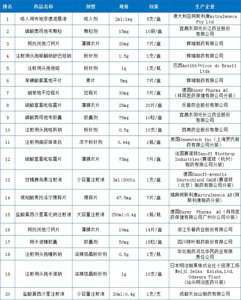 從上圖中看出,國產藥品的潛力有逐步釋放的趨勢,如樂普藥業的阿托伐他汀鈣片、硫酸氫氯吡格雷片;宜昌東陽光長江藥業的磷酸奧司他韋顆粒、磷酸奧司他韋膠囊等產品多次上榜;還有首次上榜(與去年12月相比)的成都天臺山制藥的鹽酸莫西沙星注射液。
