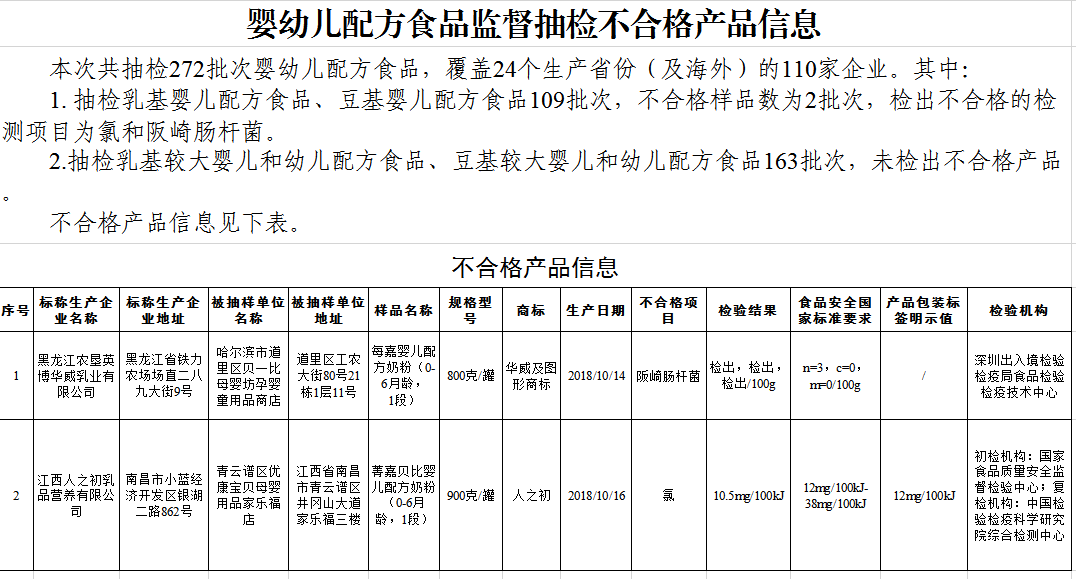 (一)哈爾濱市道里區貝一比母嬰坊孕嬰童用品商店銷售的標稱黑龍江農墾英博華威乳業有限公司生產的每嘉嬰兒配方奶粉(0-6月齡,1段),經深圳出入境檢驗檢疫局食品檢驗檢疫技術中心檢驗發現,其中阪崎腸桿菌不符合食品安全國家標準規定。黑龍江農墾英博華威乳業有限公司對檢驗過程提出異議;經黑龍江省市場監管局核實,對異議不予認可。